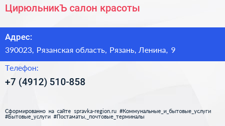 ЦирюльникЪ, салон красоты по адресу 390023, Рязанская область, Рязань, Ленина, 9 в дальнейшем Организация, размещена в следующих категориях: