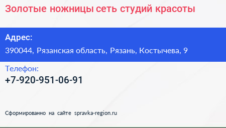 Золотые ножницы, сеть студий красоты по адресу 390044, Рязанская область, Рязань, Костычева, 9 в дальнейшем Организация, размещена в следующих категориях: