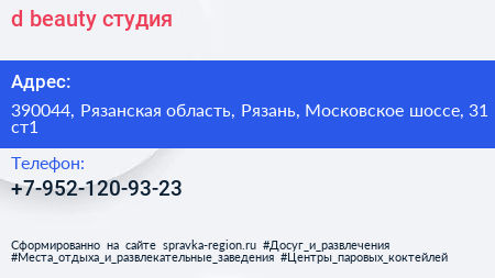 d.beauty, студия по адресу 390044, Рязанская область, Рязань, Московское шоссе, 31 ст1 в дальнейшем Организация, размещена в следующих категориях: