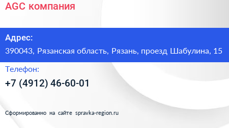AGC, компания по адресу 390043, Рязанская область, Рязань, проезд Шабулина, 15 в дальнейшем Организация, размещена в следующих категориях: