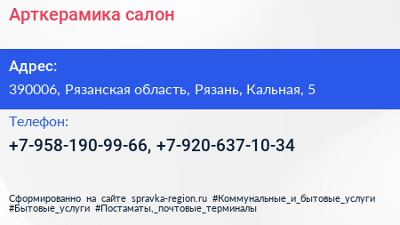 Арткерамика, салон по адресу 390006, Рязанская область, Рязань, Кальная, 5 в дальнейшем Организация, размещена в следующих категориях:
