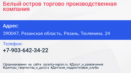 Белый остров, торгово-производственная компания по адресу 390047, Рязанская область, Рязань, Тюленина, 24 в дальнейшем Организация, размещена в следующих категориях: