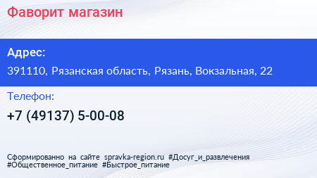Фаворит, магазин по адресу 391110, Рязанская область, Рязань, Вокзальная, 22 в дальнейшем Организация, размещена в следующих категориях: