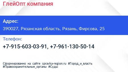 ГлейОпт, компания по адресу 390027, Рязанская область, Рязань, Фирсова, 25 в дальнейшем Организация, размещена в следующих категориях: