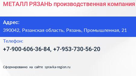 МЕТАЛЛ-РЯЗАНЬ, производственная компания по адресу 390042, Рязанская область, Рязань, Промышленная, 21 в дальнейшем Организация, размещена в следующих категориях: