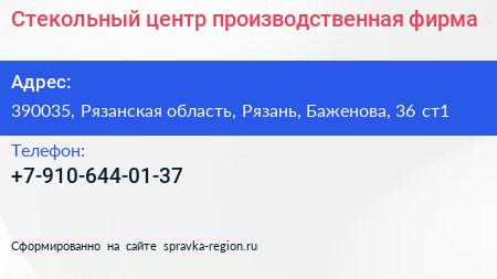 Стекольный центр, производственная фирма по адресу 390035, Рязанская область, Рязань, Баженова, 36 ст1 в дальнейшем Организация, размещена в следующих категориях: