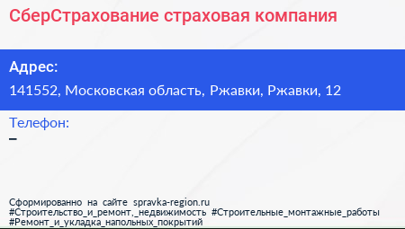 СберСтрахование, страховая компания по адресу 141552, Московская область, Ржавки, Ржавки, 12 в дальнейшем Организация, размещена в следующих категориях: