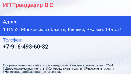 ИП Трандафир В.С. по адресу 141552, Московская область, Ржавки, Ржавки, 14Б ст1 в дальнейшем Организация, размещена в следующих категориях: