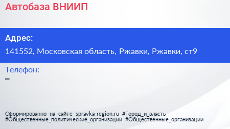 Автобаза ВНИИП по адресу 141552, Московская область, Ржавки, Ржавки, ст9 в дальнейшем Организация, размещена в следующих категориях: