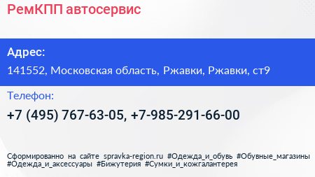 РемКПП, автосервис по адресу 141552, Московская область, Ржавки, Ржавки, ст9 в дальнейшем Организация, размещена в следующих категориях: