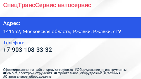 СпецТрансСервис, автосервис по адресу 141552, Московская область, Ржавки, Ржавки, ст9 в дальнейшем Организация, размещена в следующих категориях: