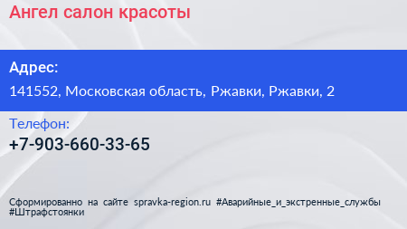 Ангел, салон красоты по адресу 141552, Московская область, Ржавки, Ржавки, 2 в дальнейшем Организация, размещена в следующих категориях: