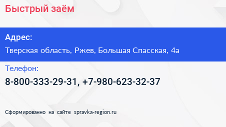 Быстрый заём по адресу Тверская область, Ржев, Большая Спасская, 4а в дальнейшем Организация, размещена в следующих категориях: