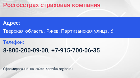 Росгосстрах, страховая компания по адресу Тверская область, Ржев, Партизанская улица, 6 в дальнейшем Организация, размещена в следующих категориях: