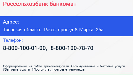 Россельхозбанк, банкомат по адресу Тверская область, Ржев, проезд 8 Марта, 26а в дальнейшем Организация, размещена в следующих категориях: