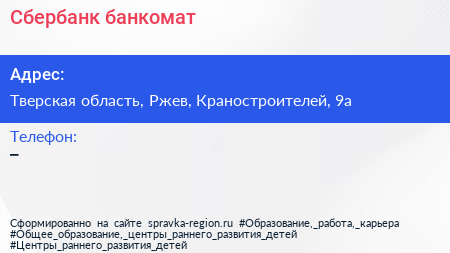 Сбербанк, банкомат по адресу Тверская область, Ржев, Краностроителей, 9а в дальнейшем Организация, размещена в следующих категориях: