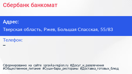 Сбербанк, банкомат по адресу Тверская область, Ржев, Большая Спасская, 55/83 в дальнейшем Организация, размещена в следующих категориях:
