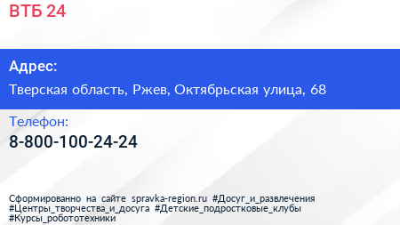 ВТБ 24 по адресу Тверская область, Ржев, Октябрьская улица, 68 в дальнейшем Организация, размещена в следующих категориях: