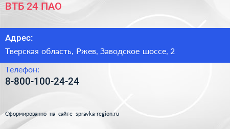 ВТБ 24, ПАО по адресу Тверская область, Ржев, Заводское шоссе, 2 в дальнейшем Организация, размещена в следующих категориях: