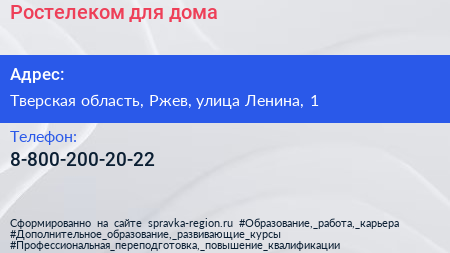 Ростелеком для дома по адресу Тверская область, Ржев, улица Ленина, 1 в дальнейшем Организация, размещена в следующих категориях: