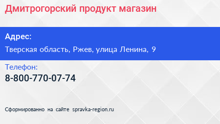 Дмитрогорский продукт, магазин по адресу Тверская область, Ржев, улица Ленина, 9 в дальнейшем Организация, размещена в следующих категориях: