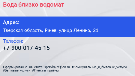 Вода близко, водомат по адресу Тверская область, Ржев, улица Ленина, 21 в дальнейшем Организация, размещена в следующих категориях: