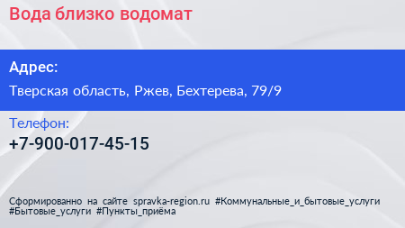 Вода близко, водомат по адресу Тверская область, Ржев, Бехтерева, 79/9 в дальнейшем Организация, размещена в следующих категориях: