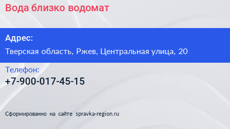 Вода близко, водомат по адресу Тверская область, Ржев, Центральная улица, 20 в дальнейшем Организация, размещена в следующих категориях: