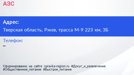 АЗС по адресу Тверская область, Ржев, трасса М-9 223 км, 3Б в дальнейшем Организация, размещена в следующих категориях: