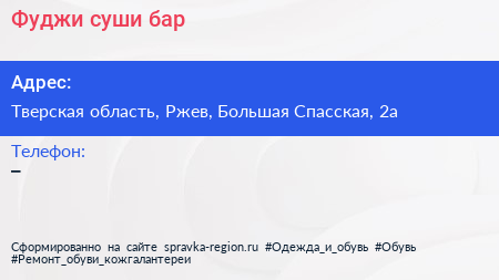 Фуджи, суши бар по адресу Тверская область, Ржев, Большая Спасская, 2а в дальнейшем Организация, размещена в следующих категориях: