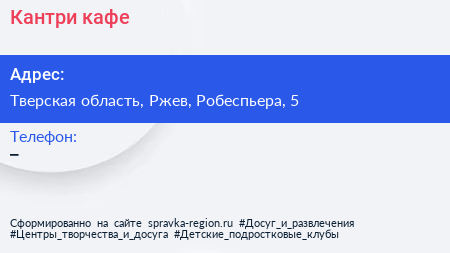 Кантри, кафе по адресу Тверская область, Ржев, Робеспьера, 5 в дальнейшем Организация, размещена в следующих категориях:
