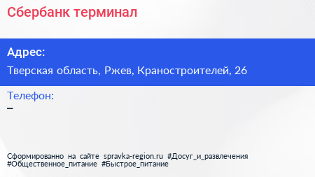 Сбербанк, терминал по адресу Тверская область, Ржев, Краностроителей, 26 в дальнейшем Организация, размещена в следующих категориях: