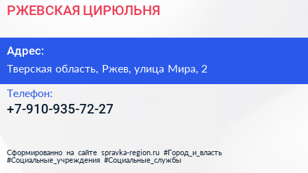РЖЕВСКАЯ ЦИРЮЛЬНЯ по адресу Тверская область, Ржев, улица Мира, 2 в дальнейшем Организация, размещена в следующих категориях: