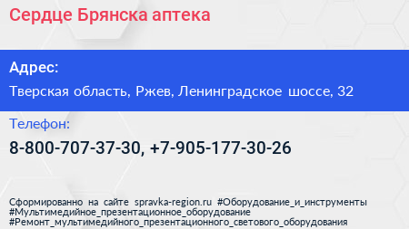 Сердце Брянска, аптека по адресу Тверская область, Ржев, Ленинградское шоссе, 32 в дальнейшем Организация, размещена в следующих категориях: