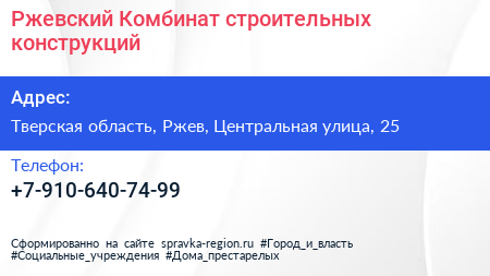 Ржевский, Комбинат строительных конструкций по адресу Тверская область, Ржев, Центральная улица, 25 в дальнейшем Организация, размещена в следующих категориях: