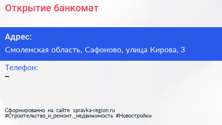 Открытие, банкомат по адресу Смоленская область, Сафоново, улица Кирова, 3 в дальнейшем Организация, размещена в следующих категориях: