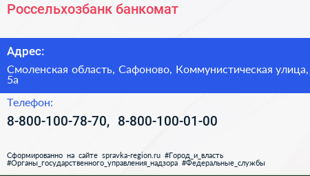 Россельхозбанк, банкомат по адресу Смоленская область, Сафоново, Коммунистическая улица, 5а в дальнейшем Организация, размещена в следующих категориях: