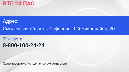 ВТБ 24, ПАО по адресу Смоленская область, Сафоново, 1-й микрорайон, 20 в дальнейшем Организация, размещена в следующих категориях: