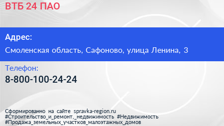 ВТБ 24, ПАО по адресу Смоленская область, Сафоново, улица Ленина, 3 в дальнейшем Организация, размещена в следующих категориях: