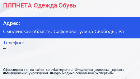 ПЛПНЕТА Одежда Обувь по адресу Смоленская область, Сафоново, улица Свободы, 9а в дальнейшем Организация, размещена в следующих категориях: