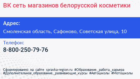 ВК, сеть магазинов белорусской косметики по адресу Смоленская область, Сафоново, Советская улица, 10 в дальнейшем Организация, размещена в следующих категориях: