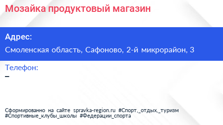 Мозайка, продуктовый магазин по адресу Смоленская область, Сафоново, 2-й микрорайон, 3 в дальнейшем Организация, размещена в следующих категориях: