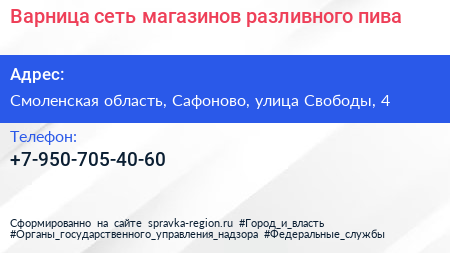 Варница, сеть магазинов разливного пива по адресу Смоленская область, Сафоново, улица Свободы, 4 в дальнейшем Организация, размещена в следующих категориях: