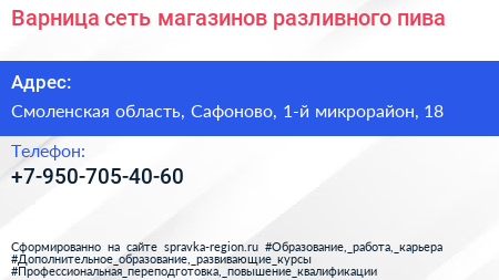 Варница, сеть магазинов разливного пива по адресу Смоленская область, Сафоново, 1-й микрорайон, 18 в дальнейшем Организация, размещена в следующих категориях: