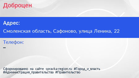 Доброцен по адресу Смоленская область, Сафоново, улица Ленина, 22 в дальнейшем Организация, размещена в следующих категориях: