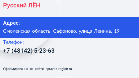 Русский ЛЁН по адресу Смоленская область, Сафоново, улица Ленина, 19 в дальнейшем Организация, размещена в следующих категориях: