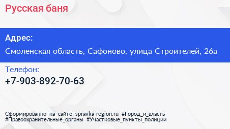 Русская баня по адресу Смоленская область, Сафоново, улица Строителей, 26а в дальнейшем Организация, размещена в следующих категориях: