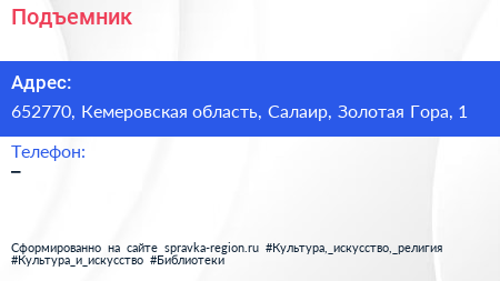 Подъемник по адресу 652770, Кемеровская область, Салаир, Золотая Гора, 1 в дальнейшем Организация, размещена в следующих категориях: