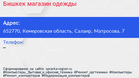 Бишкек, магазин одежды по адресу 652770, Кемеровская область, Салаир, Матросова, 7 в дальнейшем Организация, размещена в следующих категориях: