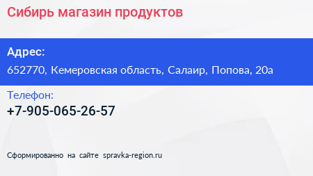 Сибирь, магазин продуктов по адресу 652770, Кемеровская область, Салаир, Попова, 20а в дальнейшем Организация, размещена в следующих категориях: